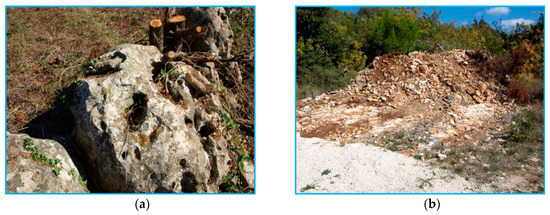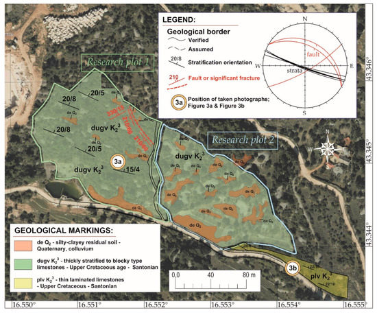 The stratification plane (SS) is almost horizontal, just slightly inclined towards the Northeast—direction azimuth 15–20°, inclination 5–15°. Axial planes (AR), although unclearly expressed because of blocky rock mass bedding, have a general direction 200°/80°. Planes perpendicular to the structural axis (b) have direction 110°/80°–85°. It needs to be remarked that only a few surface outcrops of blocky type limestone (dugv K23) are visible on Research Plot 1 of the investigation area, Figure 3a. On Research Plot 2 none of the named stone could be observed. On Research Plot 2, quaternary deposits are also present (deQ2) and on the far southeast, a relatively wide zone of thin laminated clayey limestone (plv K23) was also identified (Figure 3b). On the eastern border of Research Plot 1, fault zone was registered which could be observed along the 40 m long line. The fault strike is inclined towards the southwest with an inclination of 55°–60°. Fault planes and adjoining crack orientations are 220°/55°–60°. The fault planes match the orientation of axial planes (AR). Perpendicular to the axial planes, perpendicular planes to the structural axis (b) could be singled out with the direction 330°/15°–30°.