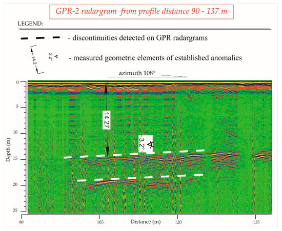 Rock quality could be well investigated using electromagnetic techniques. Electromagnetic waves propagate through the medium of blocky limestone, thus reflecting inhomogeneity with different parameters such as layer boundaries. The received signal, however, in addition to the reflected wave, also contains a direct wave that travels the shortest distance, directly from the transmitting to the receiving antenna. Therefore, the receiver's output signal is a combination of the transmitter's pulse followed by reflected pulses. This transmitter's pulse should be used as a starting point for estimating a delay time of reflected signals for the purpose of determining the target's depth. The section of the recorded GPR-2 radargram is shown in Figure 5. Dielectric permeability equal to six was chosen for a time-depth conversion procedure in blocky limestone [14]. Values are primarily controlled by water saturation and, secondarily, by porosity and mineralogy. Differences in the dielectric constant must be greater than two to produce reflections that can be recorded above background noise.
