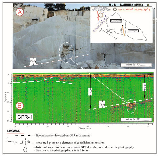 Relevant structural properties of dimension blocks were defined through a single criterion—an absence of structural and macro discontinuities [5]. Other desired parameters, like color and texture, were not considered in this work. Geophysical methods are considered to be helpful to define macro discontinuities, fractures and fractured zones [6]. Successful explorations with the use of georadar are documented as a single geophysics addition to geological mapping and core drilling [7].