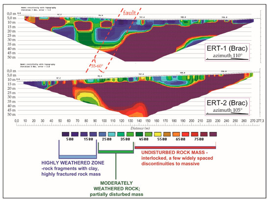 Inverse model resistivity sections of profiles ERT–1 and ERT–2. The resistivity scale is divided according to the rock mass degree of weathering.