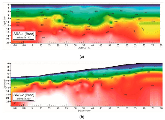 The stated condition is necessary for the wave to refract on the contact surface of two materials. With higher seismic velocity contrast, better detection of the contact plane is obtained. Figure 8 displays two seismic refraction profiles recorded at the site, showing different weathering zone depths and rock mass qualities. Geophysical properties of the weathering zone are defined according to classification of the carbonate rock mass by Novosel [25]. Weathering zones corelate to the 4th and 5th rock categories, with geophysical parameters ranging, for seismic waves, Vp = 900–2000 m/s, Vs = 400–1000 m/s, and for electrical resistivity 500–2000 Ωm.