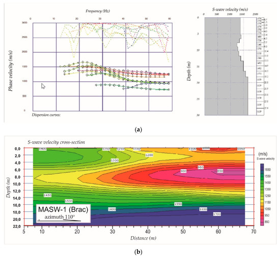 Models of compressional wave velocities (Vp), interpreted from shallow refraction seismic (SRS). (a) Deeper weathering zones could be observed on the central part of the seismic profile Vp=2000–3500 m/s; (b) Refraction seismic profile, with rock quality layers following slope inclination and bedrock compressional wave velocity higher than Vp = 4500 m/s.