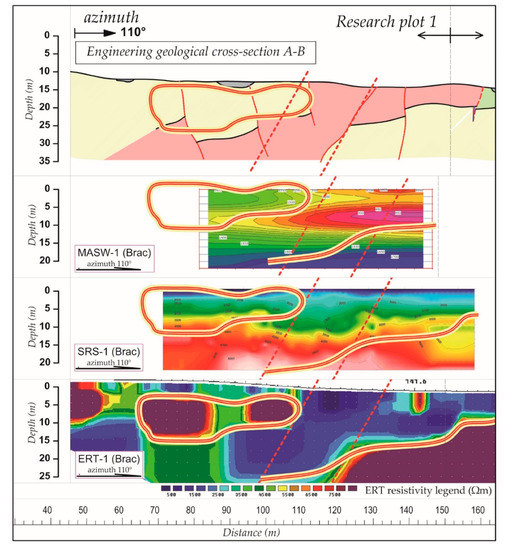 - Strelec, S.; Mesec, J.; Grabar, K.; Jug, J. Implementation of in-situ and geophysical investigation methods (ERT & MASW) with the purpose to determine 2D profile of landslide. Acta Montan. Slovaca 2017, 22, 345–358. [Google Scholar]