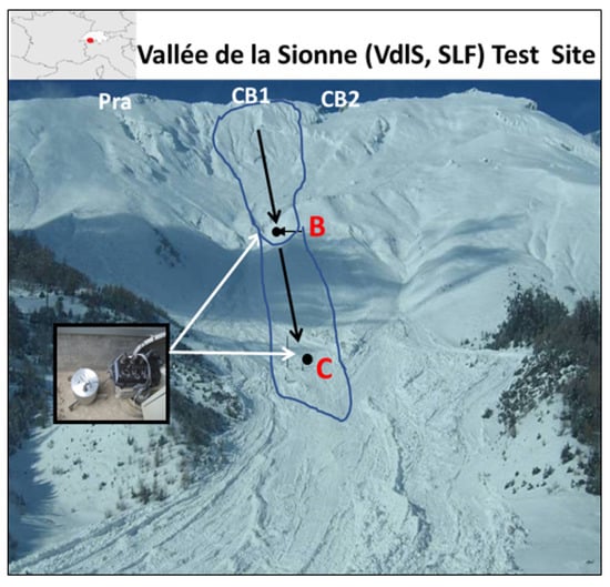 Photo of the Vallée de la Sionne (VdlS) test site (SLF). Locations of the sensors at caverns B and C at the VdlS test site (Valais, Switzerland). Pra, CB1, and CB2 release areas. Avalanche descending Gully 1 (black arrows and blue contour). Insert: seismic station (Mark L-4C-3D sensor and Reftek-130 data acquisition system). Top left: location of Valais. Approximate distances: path length: 2600 m, Difference in altitude: 1205 m (2695 m.a.s.l.–1490 m.a.s.l.). Distances: CB1-B: 985 m, B-C: 690 m.
