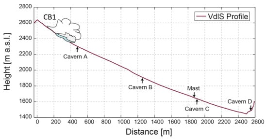 Figure 1 shows an image of the landscape of the VdlS test site (Valais, Switzerland). The characteristics of the site and the instrumentation installed has been described in detail in earlier contributions [,,,]. The UB group installed seismic sensors of three components along the avalanche path at the VdlS experimental site in 1997 []. Over the years we have increased the number of sensors from two to four (Figure 1 and Figure 2). At present, the seismic sensors are installed in a linear array at three strategic sites of the avalanche path: the release zone (cavern A), the track zone (cavern B), and the run-out zone (cavern C) with a common base of time (Figure 1 and Figure 2). Moreover, an infrasound sensor installed a few meters from the fourth seismic sensor (cavern D) at the opposite slope has been in operation since 2008. The seismic data were obtained at stations equipped with a three-component seismometer Mark L-4C-3D (Mark Products) of eigenfrequency 1 Hz and a data acquisition system Reftek–130 (Trimble). One of the major advantages of our installation is that the seismic data recording system does not depend on a triggering system and obtains data continuously, allowing us to record the signals generated by the entire avalanche and other seismic events (e.g., earthquakes, []).