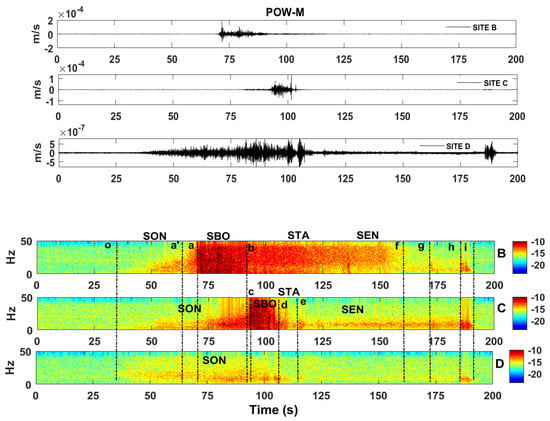 Time series (top) and spectrograms (bottom) of the final seismogram (FS) of the POW avalanche recorded at sites B, C, and D (Figure 1 and Figure 2) displayed with a common time in s (horizontal axis). Vertical axis in time series corresponds to the ground movement generated by the avalanche in m/s. Vertical axis in the spectrograms corresponds to frequency in Hz. Spectrogram amplitudes (in color) in 10−1dB. The sections Signal ONset (SON), Signal Body (SBO), STA, and SEN of each spectrogram indicate characteristics of the avalanche. Explanation of the details are included in Appendix B.