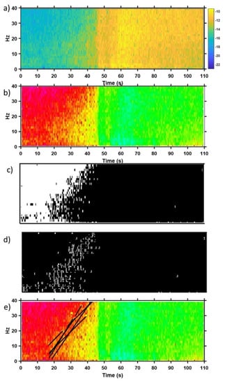 Images illustrating the application of the Hough Transform (HT) method to a spectrogram. (a) Spectrogram (amplitudes in dB in color scale). (b) SON section with band-pass filtered amplitudes. (c) Binary image (180 × 1465 pixels) of b). (d) Edge detector-binary image. (e) Straight lines after HT application to the image (d), after the change of coordinates. Vertical axis in the spectrograms (a,b,e) correspond to frequency in Hz. Spectrogram amplitudes in dB in color scale. Horizontal axis is time in s.
