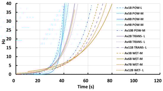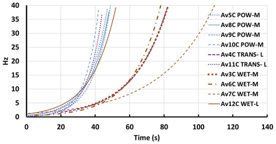 Note that the curves are bunched, according to their avalanche type (Figure 7). The curves of the POW avalanches (in light blue) are steeper, showing a sharp increase in frequency greater than that of the TRANS (in light purple) and especially the WET (in light brown) avalanches. Note that the behavior of Av10B POW-M differs from that of the other POW avalanches, being more similar to that of WET avalanches. This behavior will be considered in the discussion. Curves for WET avalanches present a gentler increase in frequency with time. A comment regarding avalanches Av11B TRANS-L and Av12B WET-L defined as transitional and wet, respectively, in the classification in [] is opportune. The behavior of Av11B TRANS-L is closer to that of the wet avalanches, whereas Av12B WET-L has a shape similar to that of the transitional avalanche Av4B TRANS-L. In the discussion this discrepancy in behavior with respect to their classification will be considered.
