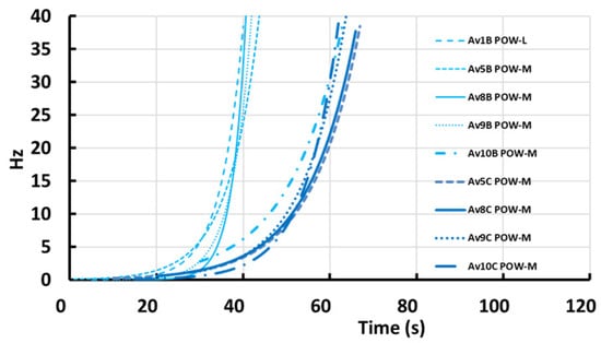Curves of Equation (14) for POW avalanches with values in Table 2 in the SON section of the spectrograms for sites B and C, respectively. The classification corresponds to that in Table 1. The curves were shifted in time for comparison. Capital letters B and C are added to the avalanche name in accordance with the site. Observe the different behavior of the curve of av10B POW-M that does not meet our requirements.