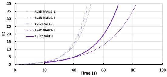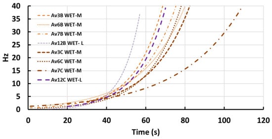 Curves for Equation (14) for WET avalanches with values in Table 2 of the SON section of the spectrograms for sites B and C, respectively. Observe the different behavior of the curves of Av12 WET-L that does not meet our requirements. The classification corresponds to that in Table 1. The curves were shifted in time for comparison. Capital letters B and C are added to the avalanche name in accordance with the site.