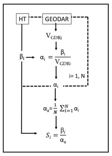 Equation (5) allows us to estimate the speed of the front of the avalanche (S) using the β(s−1) values obtained for each spectrogram. However, the parameter α(m−1) depends on the seismic characteristics of the ground (Equation (3)). In the absence of measured values of α, there is an extensive debate about how to fix this value. Different authors have assumed that α (m−1) is either constant or dependent on the frequency, e.g., [,,,]. This selection is crucial for the calculation of the energy released by a mass in movement. The choice of α has also repercussions in the calculation of the speed of the avalanche (Equation (5)). In the specific case of VdlS, no values of α (m−1) are known, although attenuation parameters κ (s−1) (spectral decay factor) in the Swiss territory have been calculated [], even if they are not the same. To resolve the absence of α values, a procedure was adopted to determine them in order to estimate the avalanche speed (S). Figure 12 shows a diagram of the procedure. To fix α from the calculated βi (from HT), we took advantage of the estimates of the avalanche velocity (VGDRi), obtained from the GEODAR system [,,]. This velocity is defined as the ground-parallel velocity down the talweg in [] and it is the projection of the velocity along the path similar to our speeds (S). We maintain below this difference (speed S (obtained from seismic) and velocity VGDR (derived from GEODAR)) in order to facilitate comprehension. Note that both values are not derived from a direct measurement. We used, when available, the avalanche velocity values (VGDRi). In fact, we focused our attention on the values corresponding to the few seconds before the avalanche reached the sensor. In other words, we considered the velocities (VGDR) corresponding to the SON section of the avalanche. We assumed an error of 10% in our visual determination from the GEODAR curves. The αi values were calculated from the βi values obtained from HT for each avalanche and for each site (B and C) using Equation (5) (Figure 12). To estimate the speed of the avalanches, we took the average, αa, obtained from the different αi for the two sites (Table 3). We obtained different values αa for sites B (0.004 ± 0.001 m−1) and C (0.010 ± 0.023 m−1), the values being higher at C than at B (Table 3). In this calculation, avalanches.