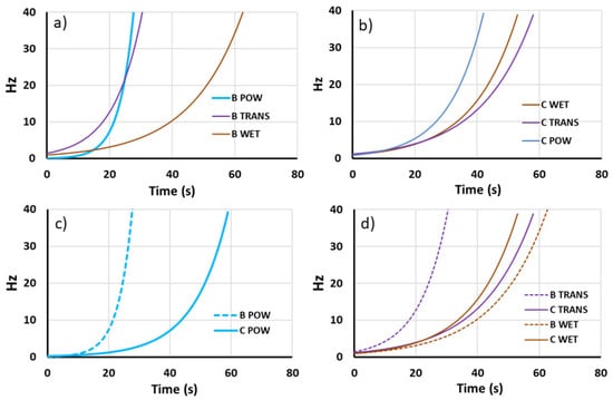 The increase in amplitudes of the frequencies in time in a quasi-exponential shape of the SON section of the spectrograms can be expressed as Equation (1)