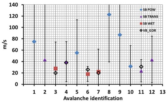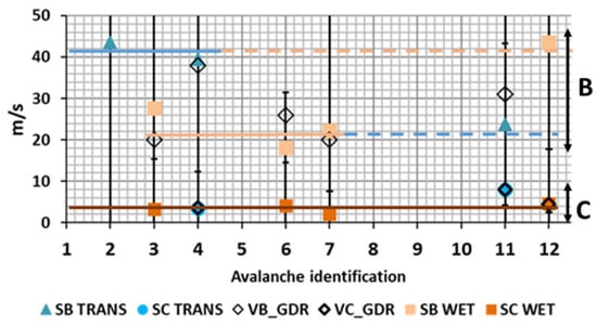 Av11C TRANS-L and Av12C WET-L were ignored because they do not meet our requirements. We also calculated the median, αm. Given that the difference was not significant when considering the errors, we maintained αa for the calculations. The avalanche speeds S were obtained using αa and Equation (5) for the βi values (Figure 12). The speed values for both sites (SBa and SCa) and the values derived from VGDR, when available, are given in Table 3. Some velocity (VGDR) values at C are absent because GEODAR signal stops before reaching the range where the seismic sensor is located.