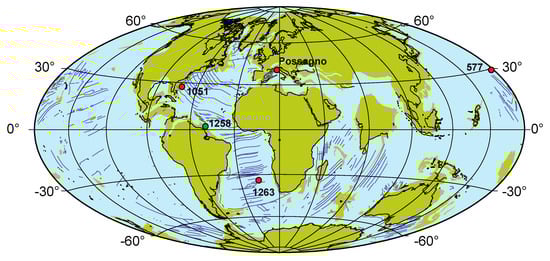 Approximate location of Site 1258 during the early Eocene (green dot). Also shown are locations of Deep Sea Drilling Project (DSDP) Site 577, Ocean Drilling Program (ODP) Sites 1051 and 1263, and the Possagno section (red dots), which each have bulk carbonate δ13C and planktic foraminiferal records spanning the Early Eocene Climatic Optimum (EECO) (e.g., [,,]). Base map is from http://www.odsn/de/services/paleomap.html with paleolatitudes modified for Sites 577, 1051 and 1258 according to www.paleolatitude.org model version 1.2 []. Possagno paleolatitude is based on the http://www.odsn.de/odsn/services/paleomap/adv_map.html model. Note that locations might be adjusted to a different reference frame to account for changes in plate motion relative to the spin axis [].
