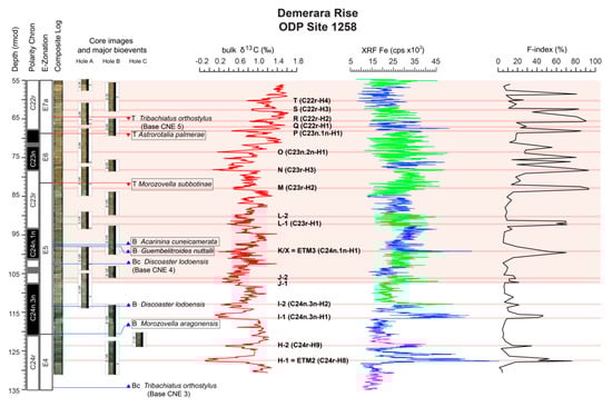 Fourthly, the finding of B of Guembelitrioides nuttalli slightly above the K/X CIE at Site 1258 is problematic, as it should set the E7b/E8 boundary. However, the position of this datum is in good agreement with the record from the Tethyan Possagno section [,] and bolsters observations at Site 1263, where it is recorded slightly above the Q CIE, and well below its putative first appearance. Luciani, et al. [] noticed that, at Possagno, the abundance of G. nuttalli varied significantly, such that there is a Base of rare specimens (Br, <1%) and a Base of common (Bc, ~4%) specimens, where the latter coincides with the base of Zone E8. The Bc of G. nuttalli, which may be a proper bioevent, was not recorded at Site 1258, according to the evidence that the interval here studied do not encompass the middle Eocene.