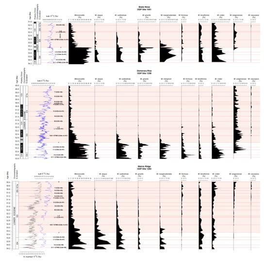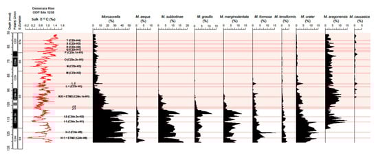 Figure 5 compares the relative abundance of morozovellid species plotted against age (Ma) from Site 1258, Site 1051 and Site 1263. Data from Site 1051 come from [] and are shown in Table S4. The greater total abundance of morozovellids at Sites 1051 and 1258 can be explained by the low latitude of these two sites with respect to Site 1263 considering that morozovellids are known warm water indices [,,]. Our data show that the various Morozovella species are differently distributed across the sites investigated. The species that display the most evident variations in abundance between sites are: M. marginodentata, M. gracilis, M. subbotinae, M. aragonensis, M. crater and M. aequa. Prior to the EECO, the first five of these species show greater abundance at the equatorial Site 1258 and subtropical Site 1051, indicating that their biogeographic optimum was at low latitudes. The evidence that the zonal marker M. aragonensis first appears at the equatorial site confirms the warm-water preference of this species and could somewhat explaining the documented diachronism of its base across several sites. Conversely, Morozovella aequa is demonstrated to have preferred temperate latitudes as it shows highest relative abundance at Site 1263. The remaining species are relatively less abundant in all the sites.