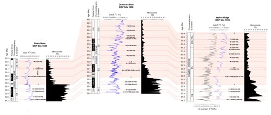 Our new data confirm issues with planktic foraminifera zonal markers across the lower Eocene, as previously highlighted [,,,]. Firstly, the B of M. aragonensis that identifies the E4/E5 boundary [] is found below the I-1 CIE at Site 1258 (Figure 2), whereas at other locations, including ODP Sites 1051 and 1263, Deep Sea Drilling Project (DSDP) Pacific Site 577 [,,] and Possagno [] this horizon lies above the I-2 CIE. Some uncertainty may lie in subtle differences between the identification of true M. aragonensis and its ancestor M. lensiformis []. We recognize M. aragonensis from M. lensiformis by its truly plano-convex test, truncated-cone shape, and rounded peripheral outline. In addition, we noted, according to [] and [,] that, as visible in umbilical sides, typical M. aragonensis tests have 5.5 to 6 chambers in the last whorl instead of 4 to 4.5 chambers of M. lensiformis. However, considering that M. aragonensis has been distinguished similarly by all aforementioned authors, we conclude that the earliest appearance of this zonal marker is not related to taxonomical problems. Rather, this datum is diachronous by at least 100 kyr (the time difference between I-1 and I-2; []), and that its true first appearance may have occurred slightly earlier at equatorial latitudes than at higher latitude areas.