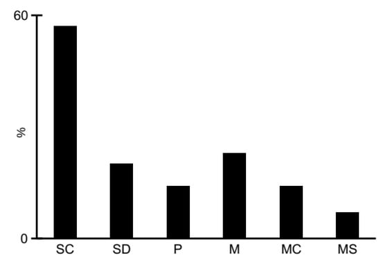 Lithological diversity of the analyzed publications considering the following broad groups: SC: sedimentary carbonate rocks; SD: sedimentary detrital rocks; P: pyroclastic rocks; M: magmatic rocks; MC: metamorphic carbonate rocks; MS: metamorphic silicate.
