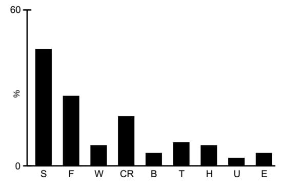 The plot represents the percentage of the studied publications that consider a given group, hence some publications will be counted more than once (e.g., if they studied a granite and a limestone) and the sum of the values will be higher than 100. More petrological details will be given in the discussion of the relations with alteration tests. It is clear that sedimentary carbonate rocks are dominant in this dataset while, on the other extreme, silicate metamorphic rocks are scarcely represented. While the plot of Figure 1 gives an indication of the lithological diversity of the studied dataset, it does not show the specific rocks considered in each publication. This will be more developed in the discussion of Section 4 but even that might fail to reveal the extension of some works such as, e.g., Ahmad et al. [], which consider 12 types of plutonic and metamorphic rocks and Pötzl et al. [], which studied 14 types of tuff.