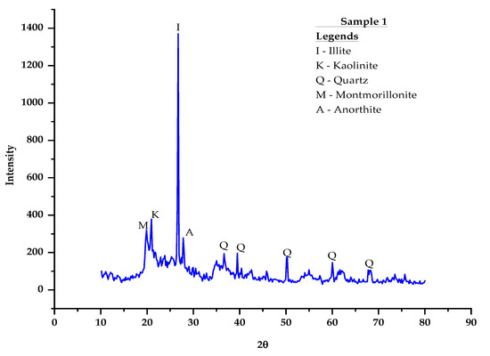 The determination of the types and intensity of minerals present in a fine-grained soil is crucial in the characterization of soil, because of its strong influence on soil behavior. The results of XRD are plotted as intensity on the y-axis vs. 2θ angle on the x-axis (Figure 8). The intensity is usually expressed as counts per second. The mineral types that are present in the soil should be determined from the graph of the XRD pattern by calculating the d-spacing at the 2θ peak intensity and then matching them with a reference of mineral diffraction data in the ICDD. Table 2 presents some of the most common clay mineral types and corresponding d-spacings. The XRD pattern identified that the dominant minerals present in the soil are illite, kaolinite, quartz, montmorillonite, and anorthite, as shown in Figure 8.