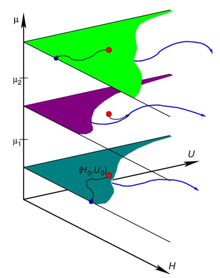 Grigorian and Ostroumov did not observe non-monotonic behavior in the “simplified” models, but those models do not include entrainment, which seems to be an essential prerequisite for this phenomenon to occur. It may therefore be instructive to study the “simplified” model enhanced by an entrainment term derived from the GOEM because it has only two degrees of freedom—the maximum of the instantaneous flow depth, H, and the front velocity U—in contrast to the infinite number of degrees of freedom contained in the fields and of the “complete” model. One can thus study such an “enhanced simplified” model with the techniques developed in the mathematical theory of dynamical systems. In principle, this can be done for any given path profile described by , but in practice one will select a few elementary types like an inclined plane or the hockeystick profile with slope angle .