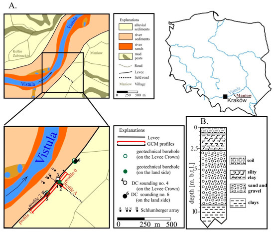 The area of the study levee is located in the Maniów district near Kraków on a floodplain terrace on the right bank of the River Vistula. The surface layer of the inter-levee area is formed of river sediments (Figure 1). Below the surface sediments, there are two types of river mud. The first type is homogeneous and corresponds to Kraków clays with a fine fraction, silty sands, and floral remnants. The second type is lean mud made up of loess and river sands. Under these muds, there are older Holocene river marshes, sand, peat, mud, gravel, and a Pleistocene sand bed (Figure 1A) [11,12].