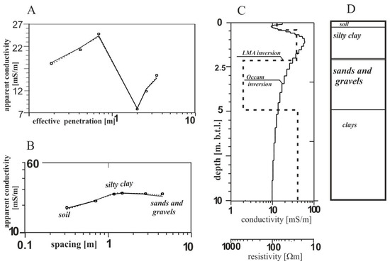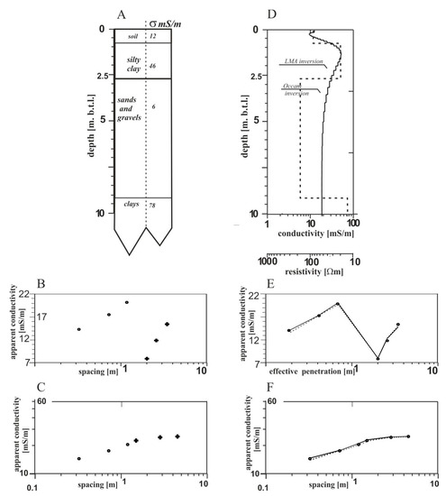 Figure 2D presents the results of the 1D interpretation of synthetic data (Figure 2B,C) by the Occam and LMA algorithms using both the IX1D and Convert software. The effective penetration and spacing are related to the depth of penetration, but the effective penetration is actively controlled by the spacing and geometrical configuration of the EM conductivity system, and the assumptions are not unduly influenced by frequency [29].