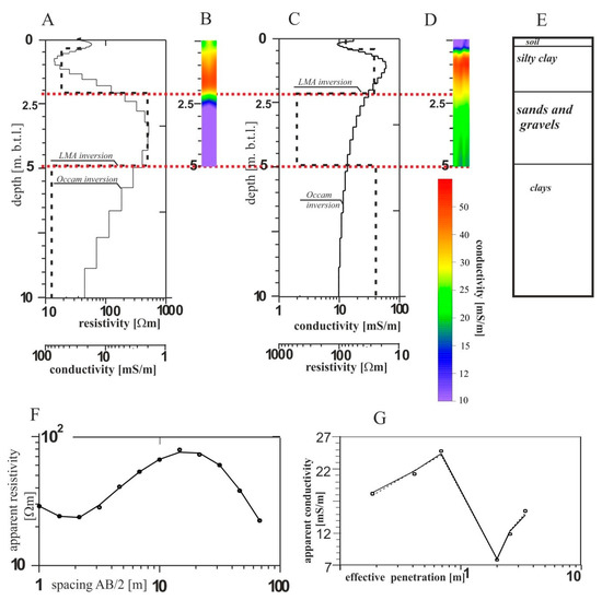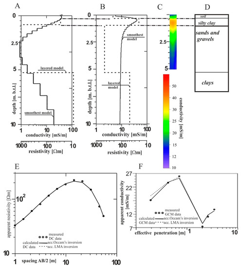 Figure 2E and Figure 2F show the accordance between the data as calculated and synthetic data from Figure 2B and Figure 2C respectively. Generally, the interpretation results (Figure 2D) closely correspond to the proposed geoelectric model (Figure 2A). The result of the Occam interpretation reflects the smooth variation of the conductivity in-depth and demarcates three layers: poorly conductive soil, freely conductive silty clay, and poorly conductive sands and gravels. On the other hand, the LMA inversion results identify sharp layer boundaries. The roof boundary of the last clay formation (Figure 2D) is related to its presence in the initial geoelectrical model (Figure 2A). These results show an excellent consensus between the data as calculated from the model and synthetic ones. In conclusion, apart from the last value, the GCM can successfully be used to determine the lithology of the layers in the study area.