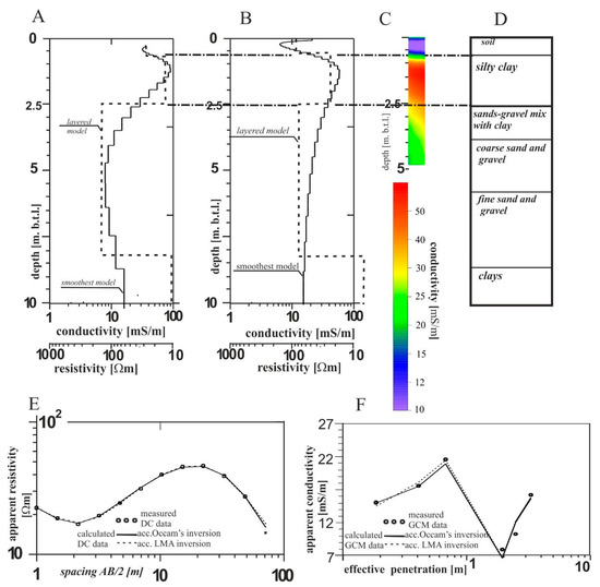 Results of an interpretation of the incorporating both the DC and GCM soundings at the location No. 5 (Figure 1) using IX1D software; A—geoelectric models obtained from the DC soundings; B—geoelectric models obtained from the GCM soundings; C—conductivity section from GCM data (for short array profiling); D—borehole data; E—fit between the measured DC data and calculated DC data; F—fit between the measured GCM data and calculated GCM data. Correlation of the silty clay layer identified by the DC sounding no. 5 and GCM sounding no. 5 (
