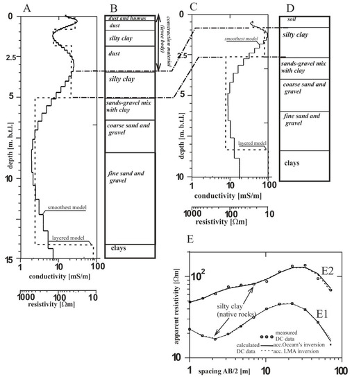 Results of an interpretation of DC soundings Nos. 4 and 5 (Figure 1) using IX1D software with 1D LMA and 1D Occam’s algorithms; A—geoelectric model from DC sounding no. 5, B—borehole lithology (close to site 5), C—geoelectric model obtained from DC sounding no. 4; D—borehole lithology (close to site 4); E—fit between the observed and calculated DC data soundings no. 4 (E2) and 5 (E1). Correlation of the silty clay layer identified by the DC soundings nos. 4 and 5 (