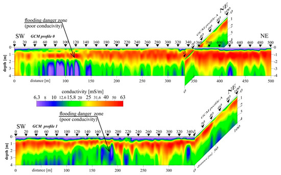 The results of the electromagnetic survey (Figure 5E,F) and the interpretation carried out at point no five close to the borehole indicate that the levee zone is generally composed of highly conductive deposits. The thickness and conductivity of the layers from top to bottom can be described as follows: on the top, there is a soil layer 0.4 m thick and a mS/m conductivity of about 12; below this are cohesive silty clays 2.1 m thick and with a conductivity of 30−50 mS/m. This layer covers a non-cohesive formation nearly 6 m thick and with low conductivity (several mS/m), and the deepest layer is formed of highly conductive clays with ~100 mS/m conductivity (Figure 5). A particular situation arises in the geoelectrical section obtained by the Occam method along with the GCM continuous measurement profile (Figure 5C). The cohesive silty clay layer is found to become thinner in a SE–NW direction.
