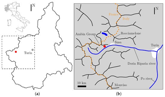 Cels-Morlière study case (red dot in the two maps above): (a) Location of the site within the Italian peninsula and the Piedmont region; (b) geographical overview of the site within the North-Western Italian Alps.