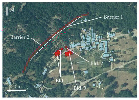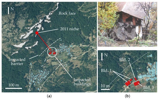 More recently, in November 2011, a large event involved the hamlet and the uphill municipal road (Figure 2a): three houses were impacted (i.e., Blds. 1, 2, and 3 in Figure 2b) by a cluster of falling blocks having an average volume of about 5 m3 (with a minimum and a maximum value of 1.5 m3 and 10 m3, respectively). A breach of their uphill walls could be observed after the event, as shown in Figure 2b. The fallen boulders also caused the re-mobilization of a 40 m3 block resting along the cliff that, after a small path, struck an outside bathroom belonging to the Bld. 2. During the event, a preexisting barrier line (build up in the 1980s and having a nominal capacity of 800 kJ) was destroyed. In the following year, the barrier was restored by removing the damaged modules and installing new ones. In addition, a new barrier alignment was installed in 2016, for a total length of 340 m and a nominal capacity of 3000 kJ. A more detailed description of the installed protection devices is provided in Section 9.2.