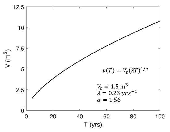 The statistical method was applied to the Cels-Morlière case study. A threshold volume of 1.5 m3 was chosen for the site because it represents the lowest rock volume that reached the hamlet in 2011. The annual frequency of occurrence was evaluated referring to the events contained within historical catalogues of the Piedmont Region and Arpa Piemonte. An observation period t = 46 years (i.e., from 1972 to 2018) was considered and events having a volume larger than were selected. The frequency was computed as and a value of 0.23 yrs−1 was estimated. In other words, an event of at least 1.5 m3 happens with a return period of about = 4.3 years. Starting from a survey of the fallen blocks observed at the foot of the cliff, the Pareto Type I parameter (i.e., ) was evaluated with the Non-Linear Least Square method and a value of about 1.56 was found. In Figure 3, a graph of Equation (1) is reported for a range of return periods between 4.3 and 100 years. The obtained volumes are in good agreement with that observed during the past phenomena: the minimum, average, and maximum size (i.e., 1.5, 5, and 10 m3) observed during the 2011 event relates to return periods of 5, 30, and 100 years, respectively. However, the return period for a 40 m3 block (i.e., the re-mobilized block in 2011 event) results in about 730 years, which seems too long for the survey evidence. In fact, a considerable number of large size blocks are observed along the slope, by revealing that the site was prone to very extensive fall in the past. The re-mobilization processes can considerably increase the volume and multiply the potential rockfall sources. This topic should be further investigated in order to properly identify all the possible scenarios.