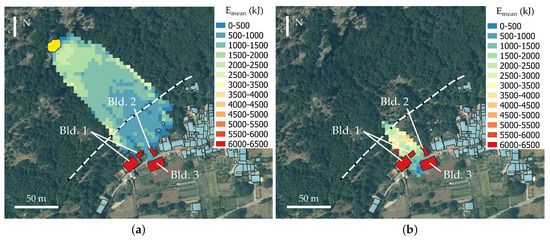 Referring to the Cels-Morlière case study, a trajectographic simulation was performed adopting the rigid body 3D probabilistic method embedded in the software Rockyfor3D [56]. This choice is due to the fact that Rockyfor3D takes into account: (i) the presence of flexible net barriers by creating three raster files which contain information about the number of nets, as well as their dissipative capacity and height, measured in the normal direction from the slope surface and (ii) the mitigation effect of trees starting from a restricted number of data concerning their species, forest density, and trunk diameter [53]. First of all, a back analysis of the 2011 event was carried out in order to choose the most appropriate soil characteristic (i.e., restitution coefficients and roughness parameters), starting from the data collected during the on-site survey. The pre-event DTM had a resolution of 5 m × 5 m and was created in 2010 by the Piedmont Region. A 5 m3 block with a rock matrix density of about 2600 kg/m3 was considered, the detachment niches observed during the on-site survey activity were set as source points, and a number of 20,000 simulations started from each of these points. The analysis is carried on by adopting a broad-leaf forest with density of 400 trees/ha, which is representative of the observed number of trees and their essence (i.e., chestnut trees). A flexible net barrier of 800 kJ capacity and 4.5 m-height was considered. The output had to be presented in terms of mean kinetic energy in order to obtain comparable quantities between the simulations made by the two software used in the paper (i.e., Rockyfor3D and QPROTO). The results of the back analysis are reported in Figure 4a, where it can be seen that the barrier is damaged, and the blocks continue their descent beyond the existing protection works. At the building’s location (Bld. 1 to 3), the obtained energies are contained in a range between 500 kJ and 1500 kJ (maximum value). These values are higher than the ones computed on the basis of the observed damages (for Blds. 2 and 3, the estimated energies are between 500–1000 kJ) but results in the best approximation of the real event. Nevertheless, the difference is considered acceptable because the trajectographic analysis has to be precautionary. A further trajectographic simulation was carried out by referring to a larger volume of about 40 m3 discharged by a source point located right above the barrier. This scenario relates to the re-mobilized block along the slope. Even in this case, the results fit quite well with the surveyed evidences, and a kinetic energy value of about 6000 kJ is registered at the location of the outside bathroom of the Bld. 1 (Figure 4b). This high value corresponds to a degree of loss of 1 (i.e., total loss), as reported by Agliardi et al. (2009) [57]. This can justify the complete destruction of the bath occurred during the Cels-Morlière event.