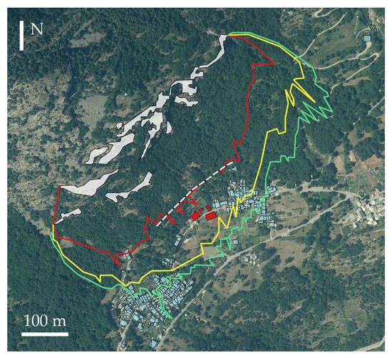 Maximum extent of the invasion areas obtained via the probabilistic software Rockyfor3D (red: 5 years—1.5 m3, yellow: 30 years—5 m3, green: 100 years—10 m3).