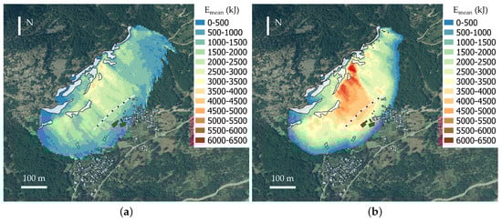 where is the elevation of the rockfall source point, is the elevation of the farthest location of the block, and () is the distance between the farthest deposit point and the rockfall source, evaluated along a straight line connecting the projection of these two points in a horizontal plane; the distance can be expressed in x and y components as . For the 2011 event, which is relative to an average volume of 5 m3, is equal to 39°. Adopting this value, QPROTO was used to conduct a forecasting simulation having as source area the same one adopted in the Rockyfor3D analyses. The comparison between the Rockyfor3D and the QPROTO outputs is reported in Figure 6a,b in terms of mean kinetic energies. It can be seen that the invasion areas are comparable. In particular, the area located uphill of the barrier is characterized by the maximum energies. In general, QPROTO returns higher values than Rockyfor3D because of the simplifications adopted. This aspect can be indeed observed at the Cels-Morlière urban area in which Rockyfor3D gives values between 500 and 1500 kJ, while QPROTO is between 2000 and 3000 kJ. The difference between the two methods is acceptable and QPROTO confirms its good reliability for large reference scales in which the precautionary nature of this tool is required. QPROTO is a mechanical-based tool adopting a simplified model to define the invasion zones and the time-independent hazard of rockfall phenomena. Its results are precautionary (i.e., larger invasion areas and higher kinetic energy content) with respect to more detailed software. It can be seen that QPROTO provides results that are in accordance with previous considerations.