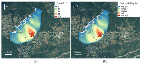 Two outputs of the time-independent hazard maps obtained through the QPROTO plugin: (a) The count file relates to the numbers of visibility cones that view a specific cell of the slope. It can be seen that the middle part of the cliff (uphill the buildings involved in the 2011 events) has the highest visibility; (b) in the susceptibility raster, the same result can be found but in a qualitative scale ranging from very low to very high susceptibility.