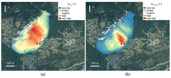 Weighted energy files provided by QPROTO plugin: (a) The w_en file provides a qualitative representation of the parameter over the estimated invasion zone. The result shows the maximum products between and the kinetic energy in each cell; (b) the w_tot_en gives the same areas highlighted in the maps of Figure 7a,b