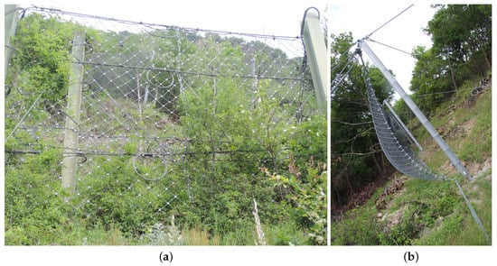An important aspect in rockfall risk management is represented by both the aging and degradation processes affecting the usually installed protection devices during their working life [20]. The maintenance issue assumes a crucial role for public administrators in assessing how long a certain investment ensures the needed risk mitigation [21]. With reference to the flexible barriers, the evaluation of the residual capacity is still an open question despite the crucial importance of ageing damages (i.e., post/rope strikes, plant filling of the net, oxidation of the structural elements, plasticization of the dissipators, etc.) that can occur during their life [21,22,23].