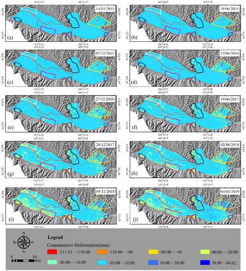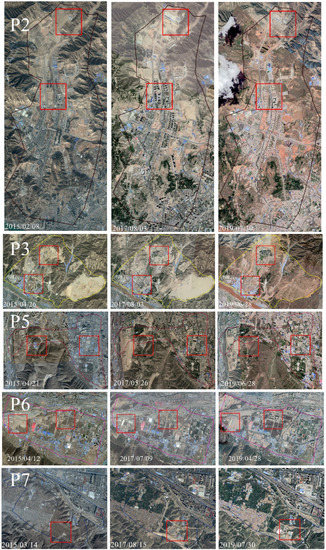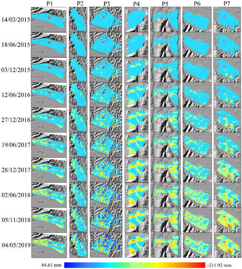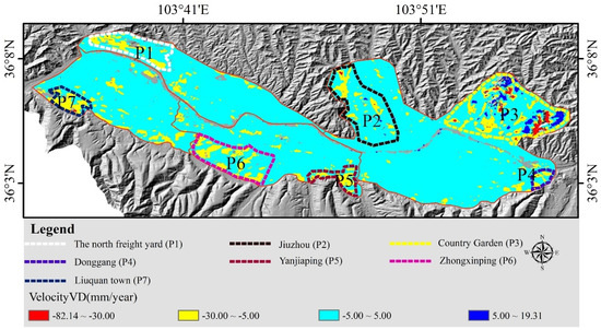 The 10 images have been selected among 75 images at intervals of about six months to show the time-series land surface deformation and reduce the number of images presented in Figure 7. At the beginning of March 2015, there were no deformations in Lanzhou; however, in December 2015 surface deformation increased over time in the major deformation regions, including Country Garden (P3), Jiuzhou (P2), Liuquan (P7) and Yanjiaping (P5). In December 2016, surface deformation was aggravated in Country Garden (P3), Jiuzhou (P2), the north freight yard (P1), Liuquan (P7), Yanjiaping (P5), Zhongxinping (P6) and Donggang (P4). In December 2017, the deformation and deformation range of the Xigu District increased rapidly. Six months later, this trend was holding back and it was gradually eliminated. In May 2019, the ultimate deformation was formed and distributed in the regions under study. More details on the distribution of the surface deformation for Regions P1−P7 are shown in Figure 8.