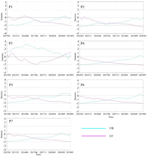 Statistics of UF and UB were calculated, and the UF and UB curves were plotted. M-K mutation test results (Figure 9) show that mutations of deformation occurred in P1 and P2 in July 2017 and September 2017, respectively, while the mutations of deformation occurred in P3 in September 2018. They occurred in P4 in May 2017, and in P5, P6 and P7 in June 2017. The significance level for all these regions was P > 0.05, indicating that surface deformation expansion was significant after June 2017, and it continued to expand. Surface deformation M–K test results are in good agreement with the time-series analysis results for Regions P1−P7 (Figure 8).