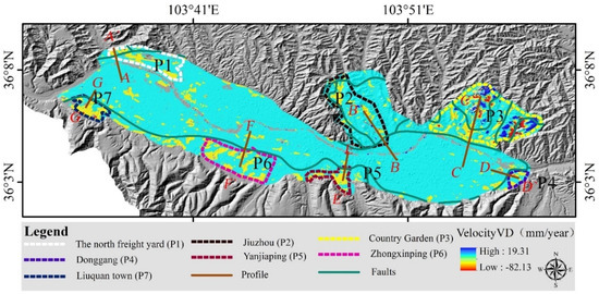 To verify the relationship between land surface deformation and geological faults, we drew seven profiles that crossed the fault lines. These profiles are placed in Regions P1−P7 (Figure 11).