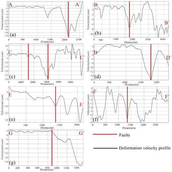 We analyzed the surface deformation rate along seven profile lines, denoted as (1) A-A’, (2) B-B’, (3) C-C’,(4) D-D’, (5) E-E’, (6) F-F’ and (7) G-G’ (Figure 12). These lines cross the geological faults.