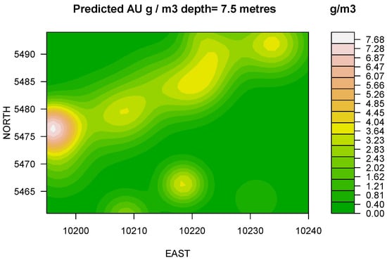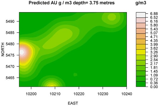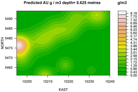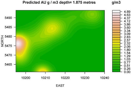 Predicted gold content at 5.625 m below the surface. Model renders a consistent increase of the apparent grade with the depth. The distribution reflects insignificant reshaping and suggests the displacement of maximums.