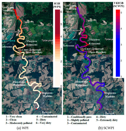 Map charts of the water quality change depending on the values: (a) water pollution index (WPI); (b) specific combinatorial water pollution index (SCWPI).