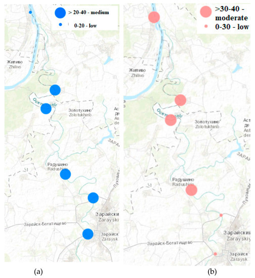 According to the water pollution index (WPI), the Osetr river water is defined as “moderately polluted” (WPI = 1.0–2.5) from Zaraysk to the Oka influx point (49.2 km) and changes to “polluted” (WPI =4.0–6.0) up to Akatyevo (2.09 km) (Figure 1a) [23].