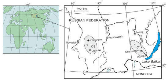 Sketch map of objects investigated within the Kuznetsk (1) and Irkutsk (2) coal basins.