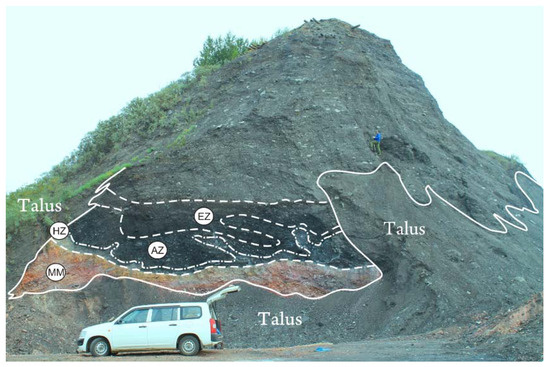 Type section of quiet spoil heap Ch-09 in Cheremhovo. The red rocks of metamorphic massif (MM) are deposited in the basement. On the metamorphic massif, the “Black block” of pyrolysis rocks is superposed, within which the following zoning is delineated: EZ–enriched zone; AZ–activated zone; HZ–heat zone. The “Black block” is overlapped by sandy and clay deposits with debris of fine and medium sandstones.