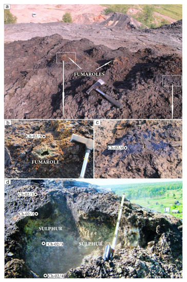 The main products of active fumaroles of spoil heap Ch-02: (a) a general view of the pyrolysis products and conical structures of active fumaroles; (b) a “crateral” part of fumaroles contoured by greenish-yellow authigenic sulphur; (c) oily resinous pyrolysis products; (d) a section of active pyrolysis fumarole, consisting of sulphur and hydrocarbon compounds, with an indication of sampling locations.